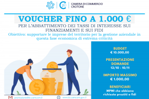 In considerazione dell’emergenza sanitaria da Covid-19 in corso e con l’obiettivo di supportare le imprese del territorio, la Camera di Commercio di Crotone istituisce un contributo a fondo perduto alle MPMI della provincia di Crotone per l’abbattimento del tasso d’interesse sui finanziamenti e sui fidi bancari finalizzati a favorire gli investimenti produttivi e la liquidità necessaria per la gestione aziendale in una fase economica di estrema criticità.